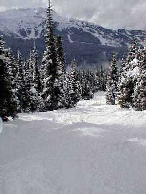 翌朝、再び 6時半にウイスラーに向かう、今日はバンクーバーは雨であったがウイスラーに近づくと雪に変った。ウイスラーは朝から2週間ぶりの雪であった。朝一番にブラックコンのゴンドラに乗るつもりであったが雪のため昨日より15分ほどゲレンデに出るのが遅くなり、ゴンドラにはすでに長い列が出来ている。空いているリフトでウイスラーの中腹まで上り、5ー10センチほどの新雪を楽しむ事にする。リフトの下を地元の10代のスキーヤーが一人、見事なシュプールを描いて滑り降りていく。そこはまだ岩や倒木の障害物が一杯の所でもう1フィート降らなければ、かなり腕に覚えのある人でも降りようと思わない場所である。その若さがうらやましい。