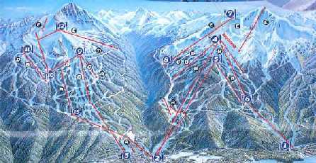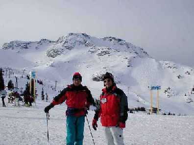 リフトを乗り継いで山頂に立つと周りの山々が見える、この地点が標高 7160フィート、向かいのブラックコンの山頂が7494フィートである。高度的に言えばこの山頂がマンモスで言えば麓である。そのためか空気が濃くマンモスより呼吸が楽に感じる。この日のためにマンモスで高地トレーニングをしていたようなものかもしれない。山頂からどちらに降りたら良いか迷いながらも、とりあえず一度一番下まで降りてみようと言うことになり一番西にあるウィスラー・クリークへ降りるコースを取ってみる。始めて山頂からベースを目指す訳だが、適当にバンプもありモーグルの好きな私には変化に富んだ面白いコースである。ところが下りても下りてもゲレンデは続く。ここの最長コースは7マイル(11.27 キロ)と聞いた。マンモスでも3マイルで後半はちょっとだれぎみの斜面になるから、このように滑りがいのある7マイルは世界にもそんなにないはずである。そのため、このスキーのメッカにはアメリカはもとよりヨーロッパ、 日本、と世界中からのスキー客が訪れている。いい加減くたびれた頃、やっと下に街が見えた、終点はまだまだ先らしい。しかしこの位のところから固く凍った雪質で流して滑るしかなく、あまり面白くない、これで新雪だったらどんなにすばらしいスキー場だろうと思ってしまう。